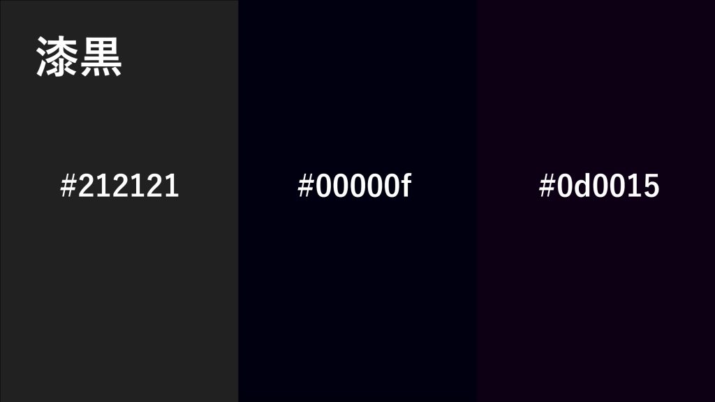 #212121などは「墨色」に近しい印象があります。どちらかというと他の二色の方が「真黒」という名称には近しいと思いました。