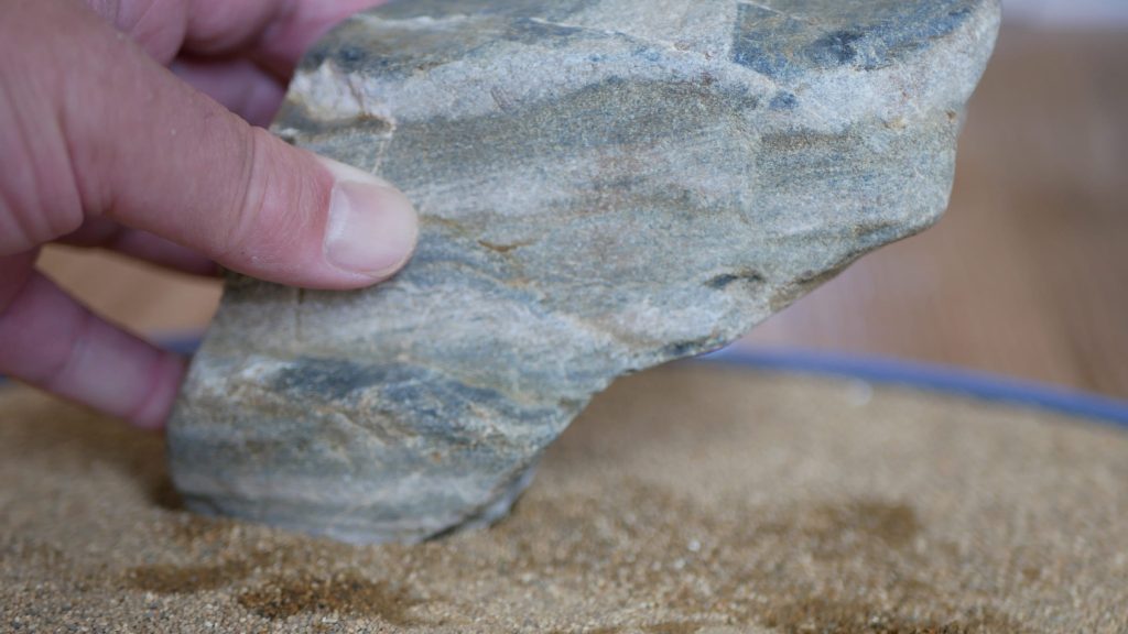 上部のせり出しがもっと薄く長く突き出していれば、緊張感が出て良かったと思いますが・・・とはいえ、海辺のホルンフェルスの崖・えぐれを感じさせてくれる石で、個人的には気に入っています。